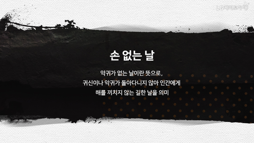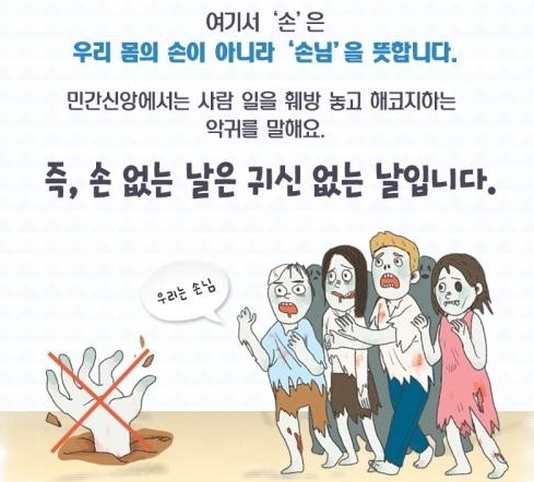 '손 있는 날'은 ▷음력으로 초하루/초이틀, 즉 끝수가 1·2일인 날에는 동쪽 ▷초사흘/초나흘, 즉 끝수가 3·4일인 날에는 남쪽 ▷초닷새/초엿새, 즉 끝수가 5·6일인 날에는 서쪽 ▷초이레/초여드레, 즉 끝수가 7·8일인 날에는 북쪽에서 귀신이나 악귀가 활동하는 날로 여겨, 이날을 피하여 택일을 정하는 데 활용하고 있습니다.
